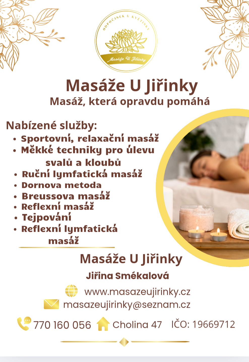 Velmi příjemnou relaxační masáž celého těla provádím pomalými a plynulými tahy. Prokrví a uvolní svaly, které jsou ztuhlé nedostatkem pohybu, špatným držením těla či stresem. Tím se následně uvolňuje celý pohybový aparát. Prokrvení během masáže zároveň zrychluje látkovou výměnu a podporuje tak odplavování nahromaděných odpadních látek z těla lymfatickým systémem. Celotělová masáž prospívá nejen svalům, ale celému tělu včetně kloubů či vnitřních orgánů. Regeneruje organismus a odstraňuje únavu. Dodá pocit lehkosti tělu i mysli.
